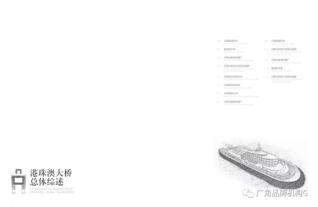 面對厚厚的一沓又一沓專業性極高的技術資料,廣角團隊認真研讀,提煉核心,最終確定了畫冊的版塊劃分與各章節內容,從以下四個層面來展示大橋島隧工程的情況: