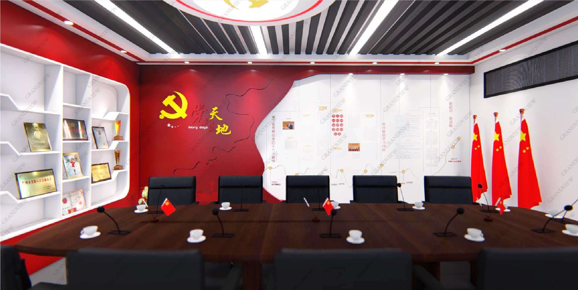 對外,可展示黨的歷程和發展故事,學習黨的精神,感受黨的莊嚴和神圣;對內,可進行黨建會議的召開,促進廣州地鐵十二號線的高質量發展,防火的搪瓷鋼板元素的采用與地鐵的實際情況相符,大量紅色元素的應用產生強烈的視覺沖擊。