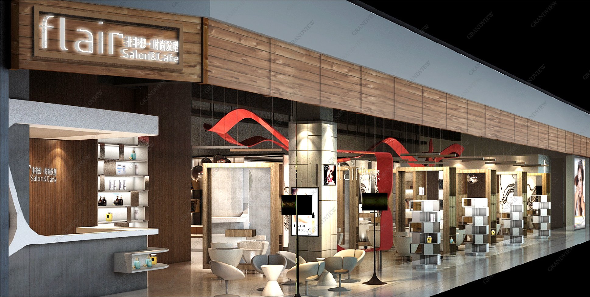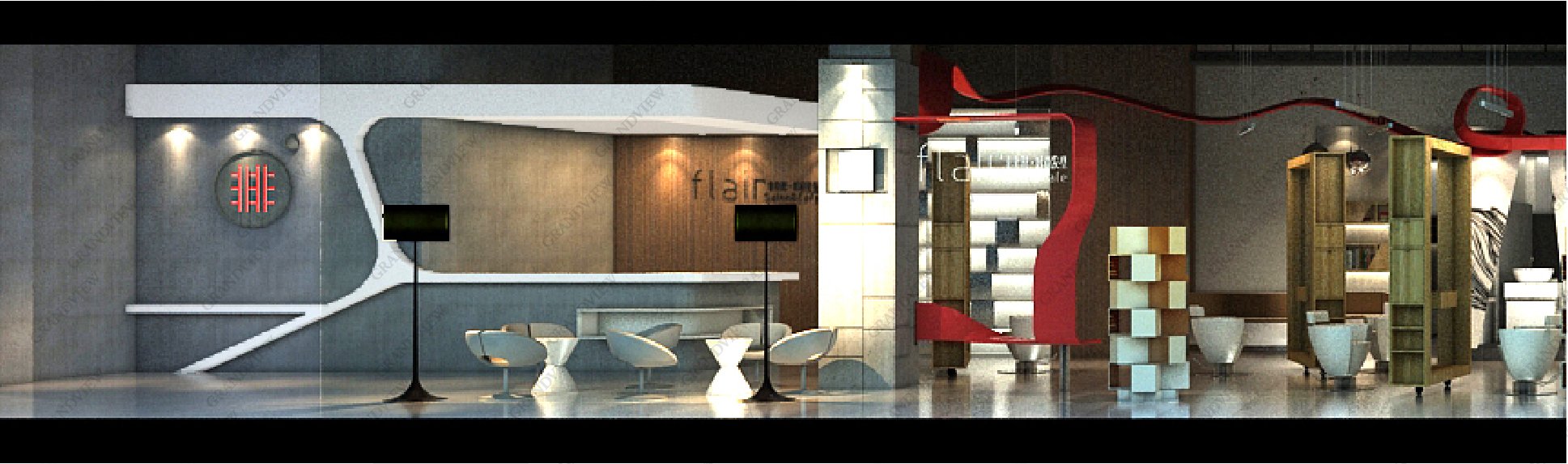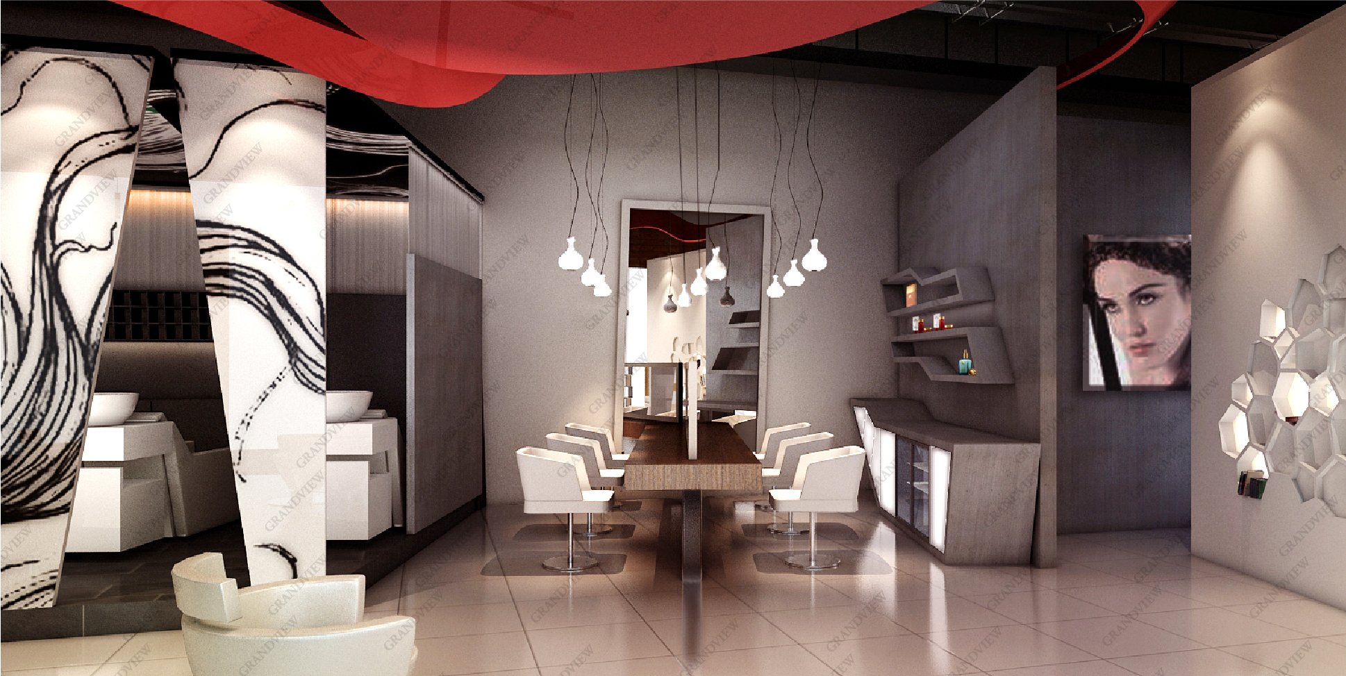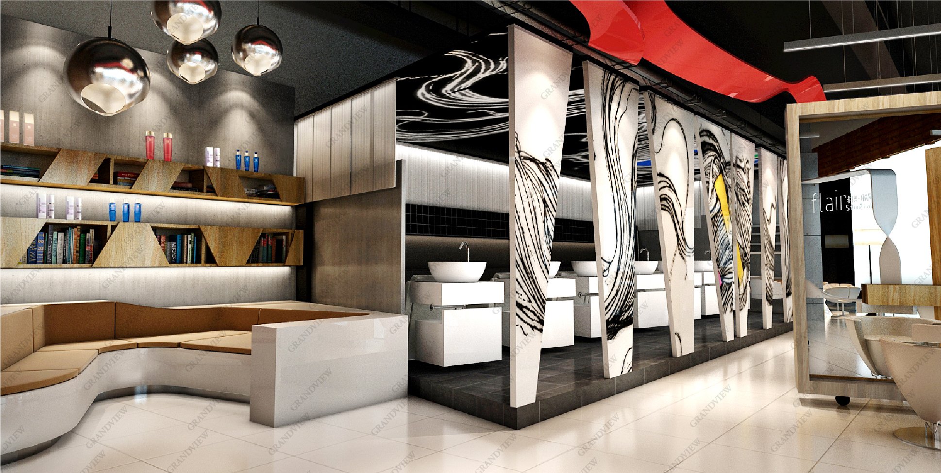 黑白灰為主色調高級感十足,精心設計的線條元素具有飄逸的美感,光影的效果絲絲入扣,撩人心扉。廣角以現代簡約的展廳布置風。使非非想以藝術形式演繹著一段以發絲為主角的傳奇,非非想發型設計打造最自然的美的初衷,展示呈現高端時尚品牌定位。